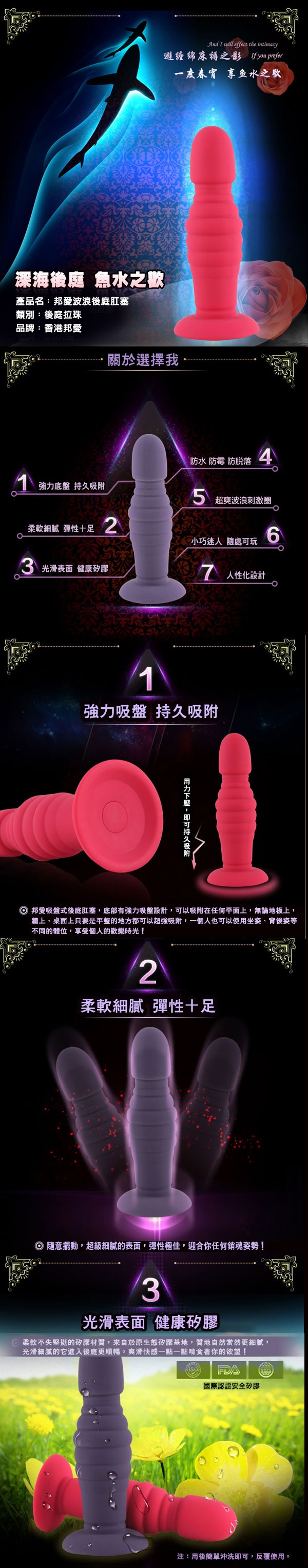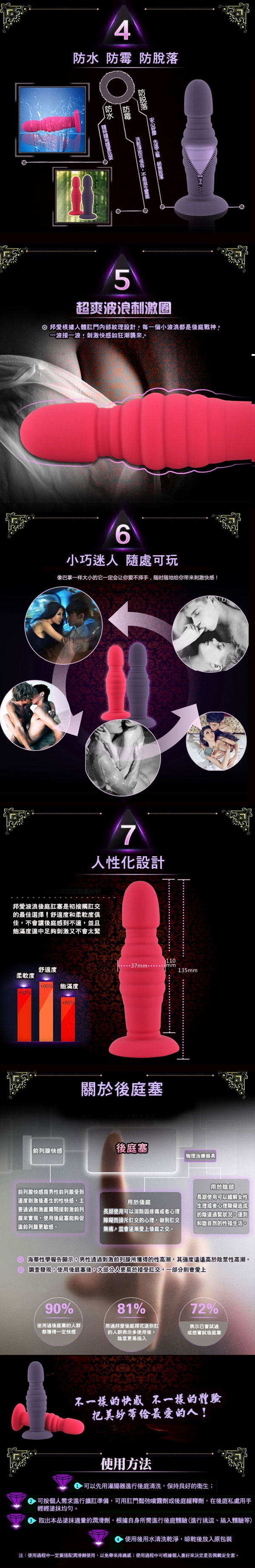由香港邦愛Loveaider推出,本商品使用最頂級的安全無毒矽膠膠材質,觸感柔細舒服軟硬度適中,底部設計有一強力吸盤,可以吸附在任何平面,一個人就能享受快樂時光不求人,頭部較小的設計讓頭部可以很輕易的滑入肛門,進入肛門時馬上就可以慢慢感到擴約肌被撐開的快感,由棒身有一圈一圈的環狀凸紋,漸進式的設計,每一道環紋在通過肛門時可以讓人感到一縮一放強烈的快感直襲腦門,這是一種很難形容的快感,只有體會過才能明明箇中滋味,是後庭玩家必收藏的玩具之一。