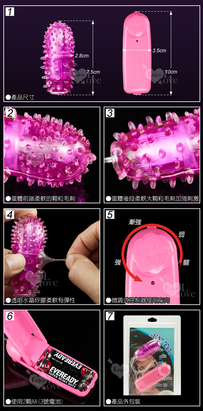7公分長的大跳蛋的表面套上超柔軟的水晶套更呵護女性敏感的私秘處,蛋體佈滿軟膠凸刺更能有效刺激女性敏感區域,對妳的陰蒂及陰道壁將進行強烈刺激;富有變化的強力震盪功能,動力澎湃,讓妳很快便可達到興奮狀態,是您隨時隨地獲得高潮的貼心寶貝。
