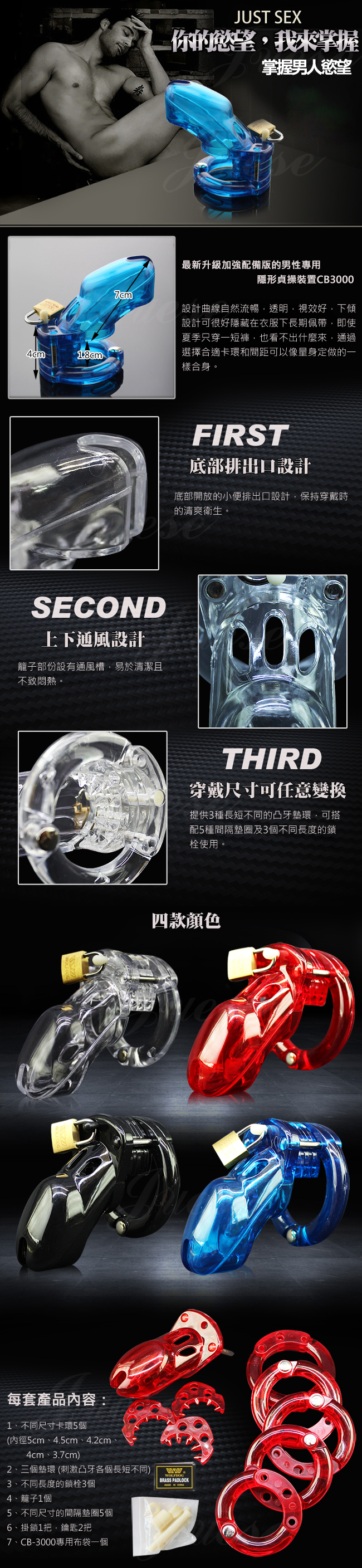 最新升級加強配備版的男性專用-隱形貞操裝置CB3000,設計曲線自然流暢,透明,視效好,下傾設計可很好隱藏在衣服下長期佩帶,即使夏季只穿一短褲,也看不出什麼來,通過選擇合適卡環和間距可以像量身定做的一樣合身。