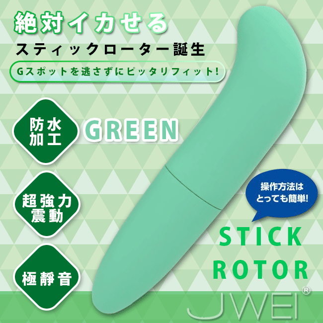 力モーター内蔵で力強い振動刺激を繰り出しながらも、超静音設計でモーター音を全く気にせず楽しむことができる、スティックタイプのローター。 ユーザーのアンケートから採用されたグリーンのカラーリングが可愛らしく、コンパクト且つ軽量で片手でも扱いやすく、操作も捻るだけのシンプル設計なので、グッズ初心者の方でも気軽にお使い頂けます。 しかしながら、そのボディに秘めたパワーは驚くほど強力で、程よく曲がった先端部分がGスポットをしっかり捉えてダイレクトに責めるので、あっという間にイカされちゃいそうな、強烈な快感を味わうことができます。生活防水加工されているので、お風呂などでもお楽しみ頂くことが可能です。