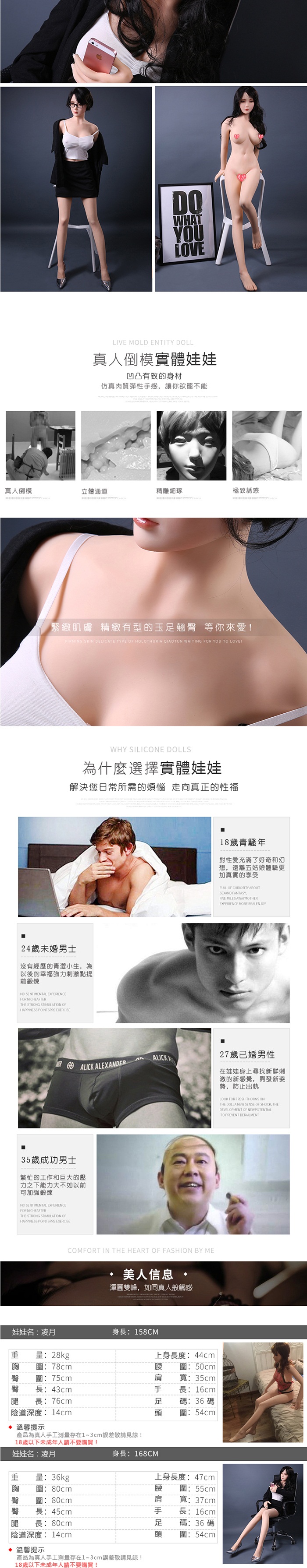 【材料】外皮(皮膚)為高級無毒超軟TPE,內有金屬骨架,四肢的活動範圍與真人類似。