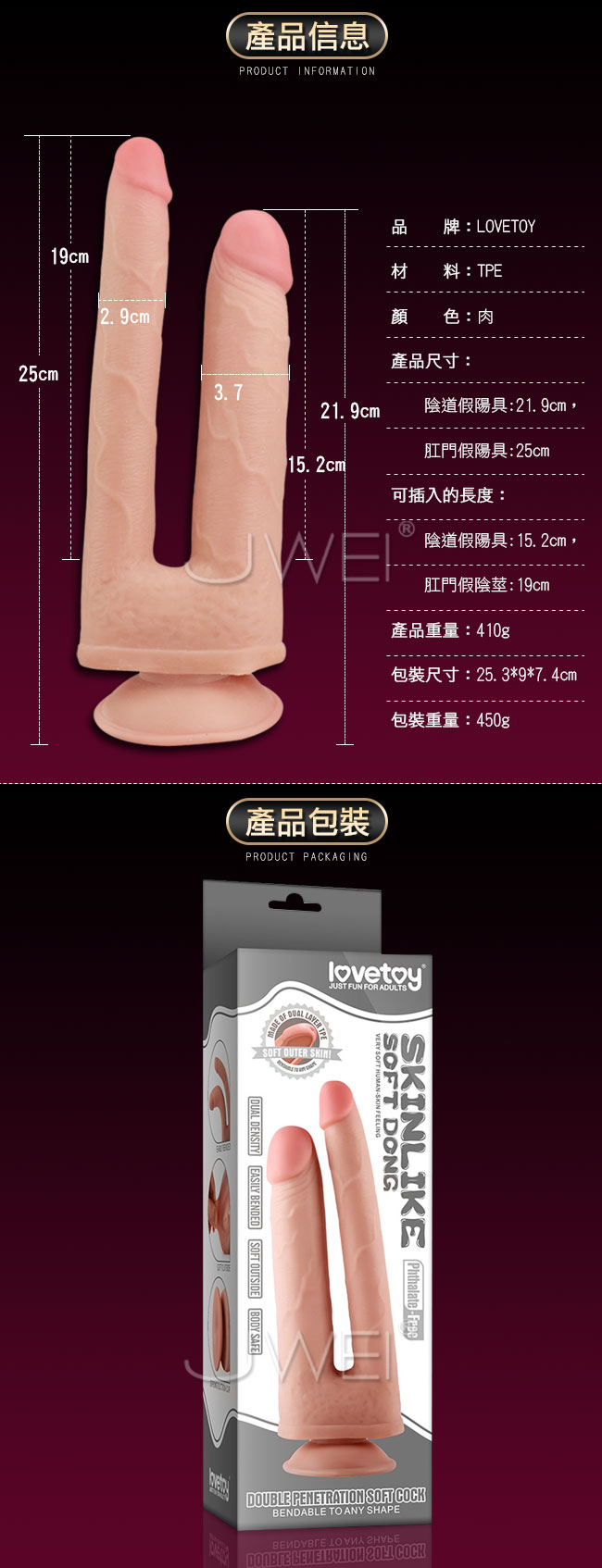 逼真的外型構造,獨特雙頭設計兩端頭部粗細不同,滿足女性各種需求,讓女性欲罷不能。柔軟雙層TPE材料製成,雙密度技術可以模擬柔和的外層,並且中心獨特的龍骨結構設計使按摩棒容易彎曲到任何角度,插入時根據喜好和姿勢來支撐或調節,讓您不管是前陰還是後庭都能得到大大得滿足,不再覺得空虛~強力吸盤讓您不在哪裡都能享受激情慾望,徹底解放您的雙手~