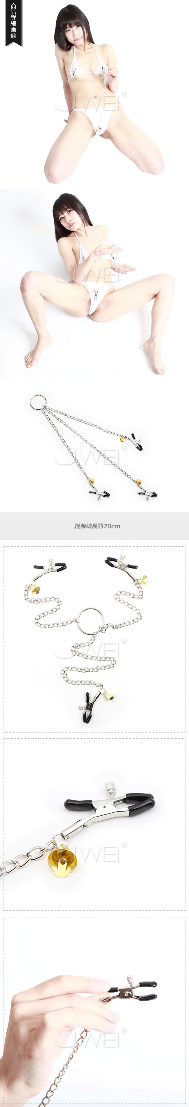 感じやすい三カ所をダイレクトに同時に刺激するチェーン付クリップです。 3つのクリップをチェーンで繋いだアイテムで、両乳首とクリを同時に挟み刺激可能なアイテムで、クリップの挟む力は調節可能。 クリップ先端は柔らかく弾力のあるゴムで覆われているので、デリケート部分を挟む時に傷つける心配は軽減。 また、クリップを装着した上に服を着て外出し、鈴に音が周囲にバレないかハラハラ・ドキドキのプレイを楽しむ事も出来ちゃいます。 興奮度マックスの3点同時責め用クリップです。