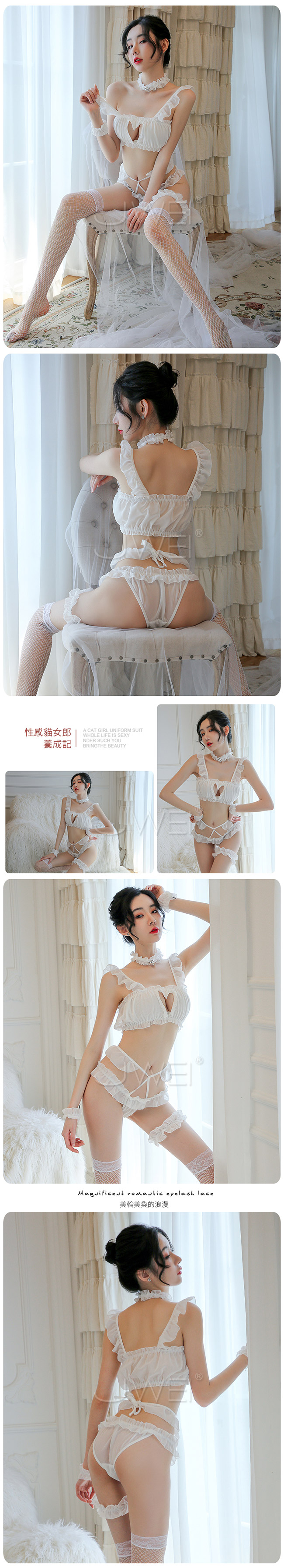 ◇◆俏皮蜜糖.鏤空愛心三點式貓女郎套裝五件組(白色)◆◇