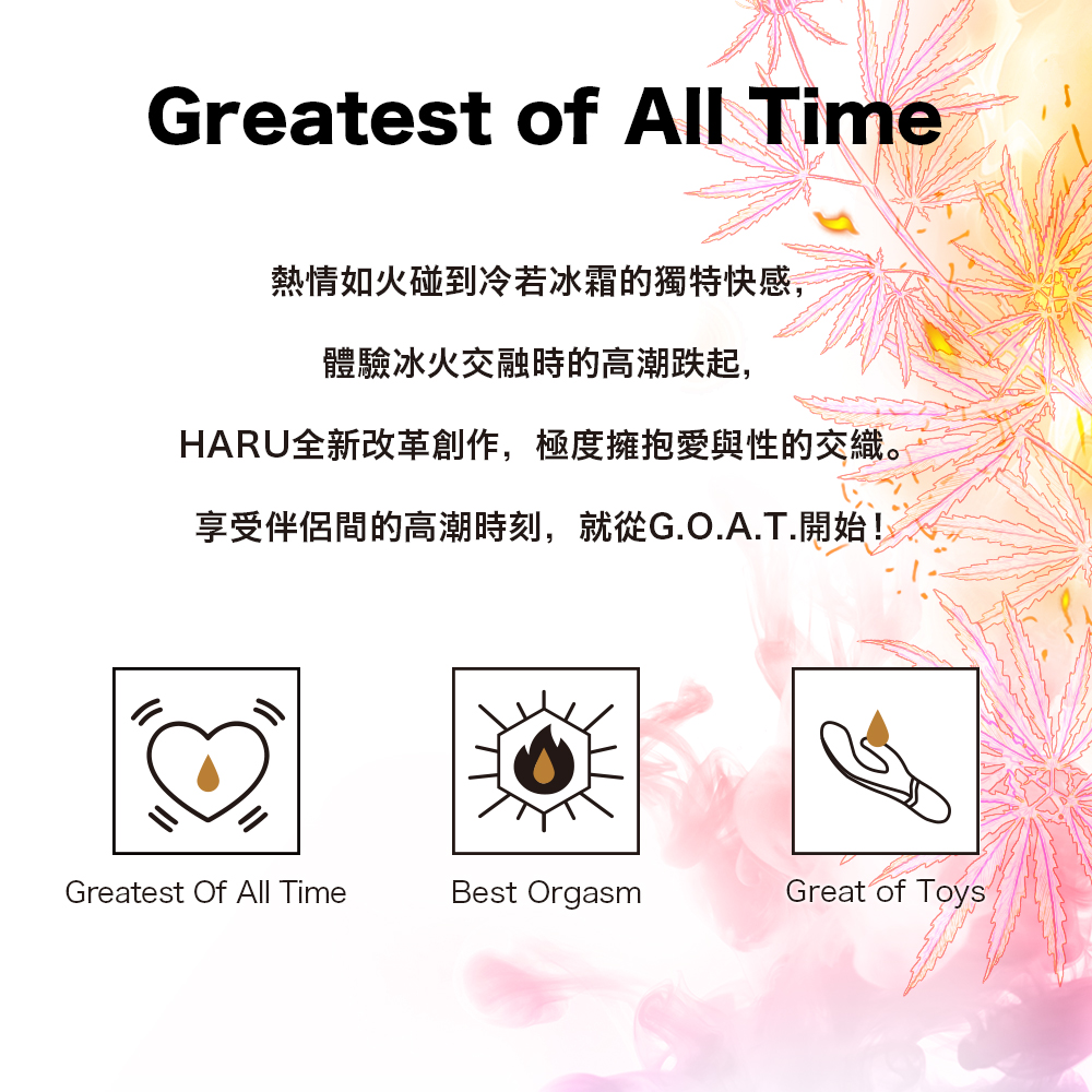貼心體醒: G.O.A.T.為高刺激敏感性冰火高潮液,使用於敏感部位,能快速有效的達到冰火交融的快感!!對於體質較敏感的粉絲,可能會有過敏或無法享受刺激所帶來之高敏感反應,請自行斟酌評估後再行購買!! 本產品因屬私密用品,一經拆封即不可退貨!!第一次使用的粉絲,也很歡迎先嘗試HARU 其他熱感潤滑液款式(依照熱感反應由低到高分別為STEAMY<Orgasm<Orgasm by jack herer <G.O.A.T.)後再行斟酌是否享用G.O.A.T.