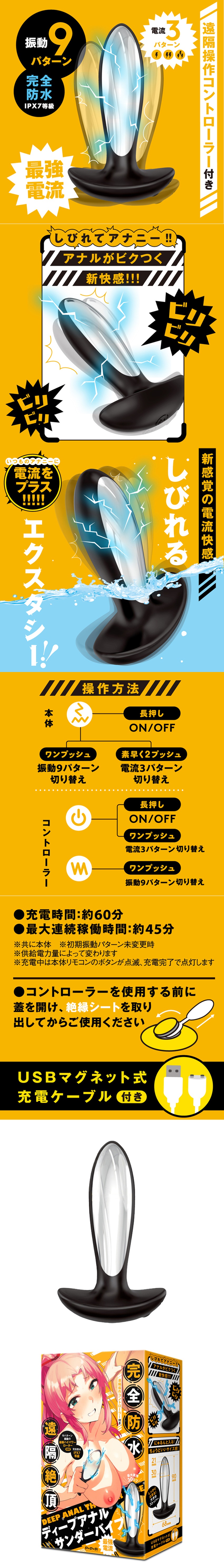 內置3種電擊模式和9段震動變頻,絕對能讓你興奮發痲,狂喜昇天!充電時間約60分鐘,最長連續使用時間約45分鐘,配合IPX7等級的防水功能,完全能滿足所有玩家的需求!
