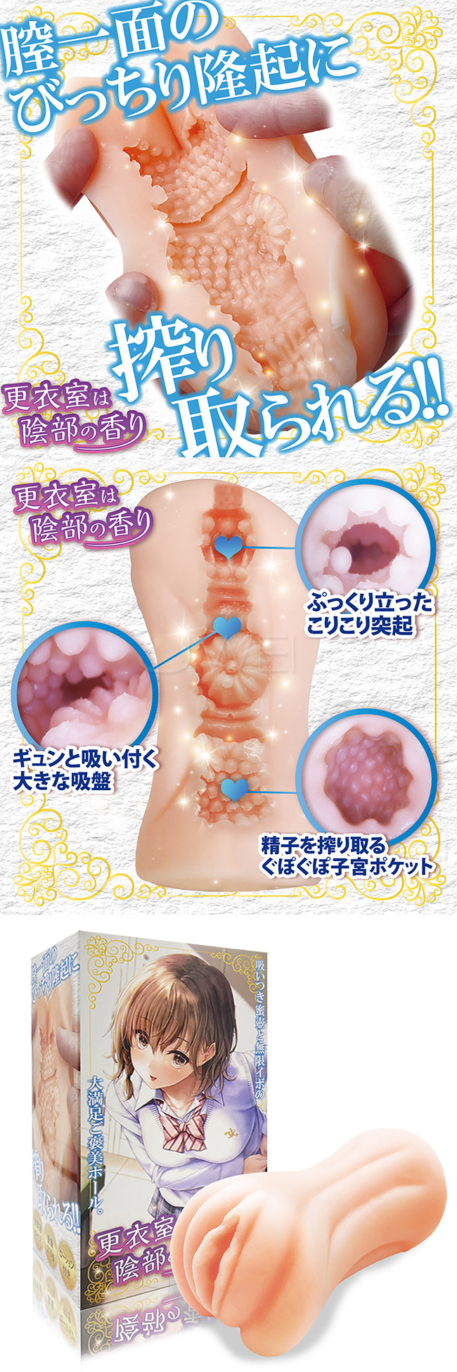 吸い付き蜜壺と無限イボの大満足ご褒美オナホール!フレッシュなぴちぴちハリのあるスキン素材で、ぎゅっと包み込みます。膣一面にびっちりと余すところなくついた隆起のイボイボが、ストロークのたびにゾリゾリと刺激!入口は、ぷりぷりとしたラビアが貴方を奥まで誘います。中間に鎮座する大きな吸盤が彼女のGスポット♪そこを目掛けて亀頭を当てれば、チュウチュウと先っぽに吸い付きます。ぐぽぐぽといやらしい音をたてる子宮に向かって、射精フィニッシュ!