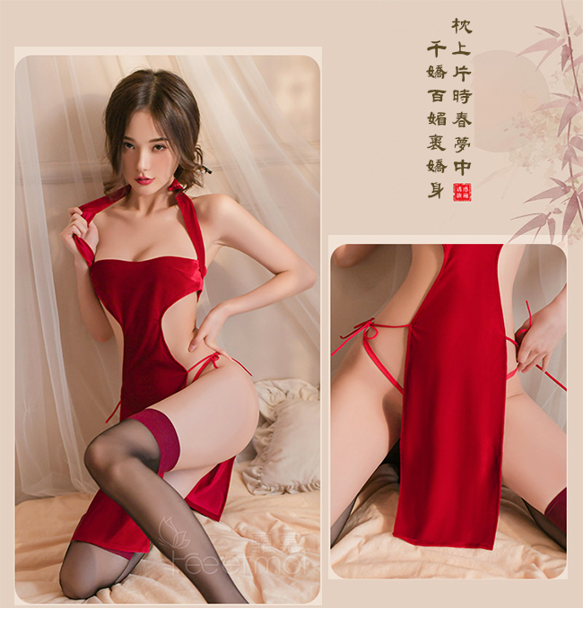 ►您現在的位置:首頁>仿旗袍睡衣!中國風腰側鏤空高開衩分片式綁帶絲絨含襪三件組