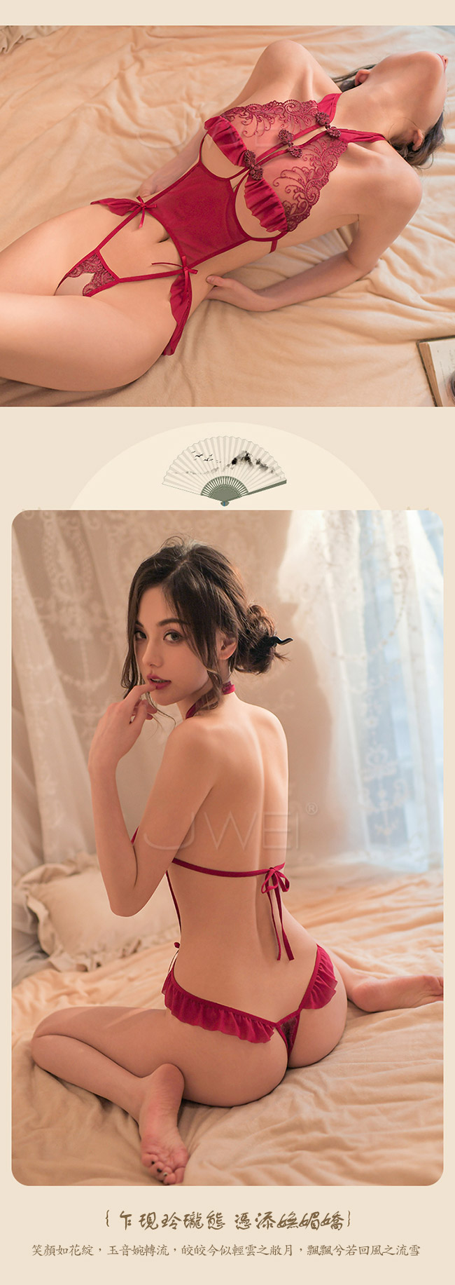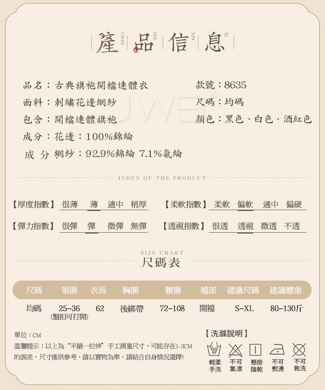 復古回潮,現代與古典相結合 旗袍立領設計 鑲嵌立體盤扣,精緻典雅 蕾絲緊貼身形 迷離花蔓襯得玉肌隱隱綽綽 挖空展露的傲人雙峰 配上心機開襠,讓人垂涎 指尖觸碰,流蘇晃動,盪入心頭 在翹臀與美腿之間,沉淪......