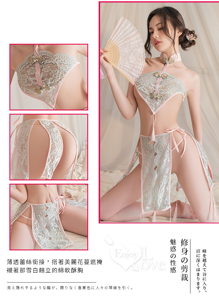 ►您現在的位置:首頁>仿旗袍睡衣!掛脖肚兜緹花蕾絲流蘇點綴分片式綁帶裙三件組