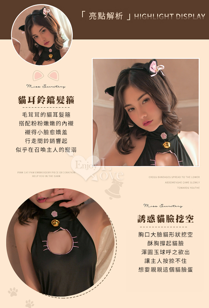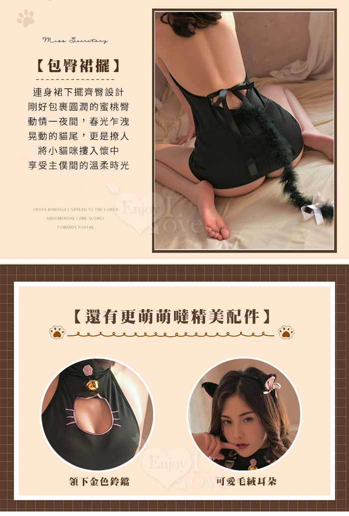 情趣睡衣!貓耳髮飾造型鏤空削肩裸背連身裙三件組﹝黑﹞