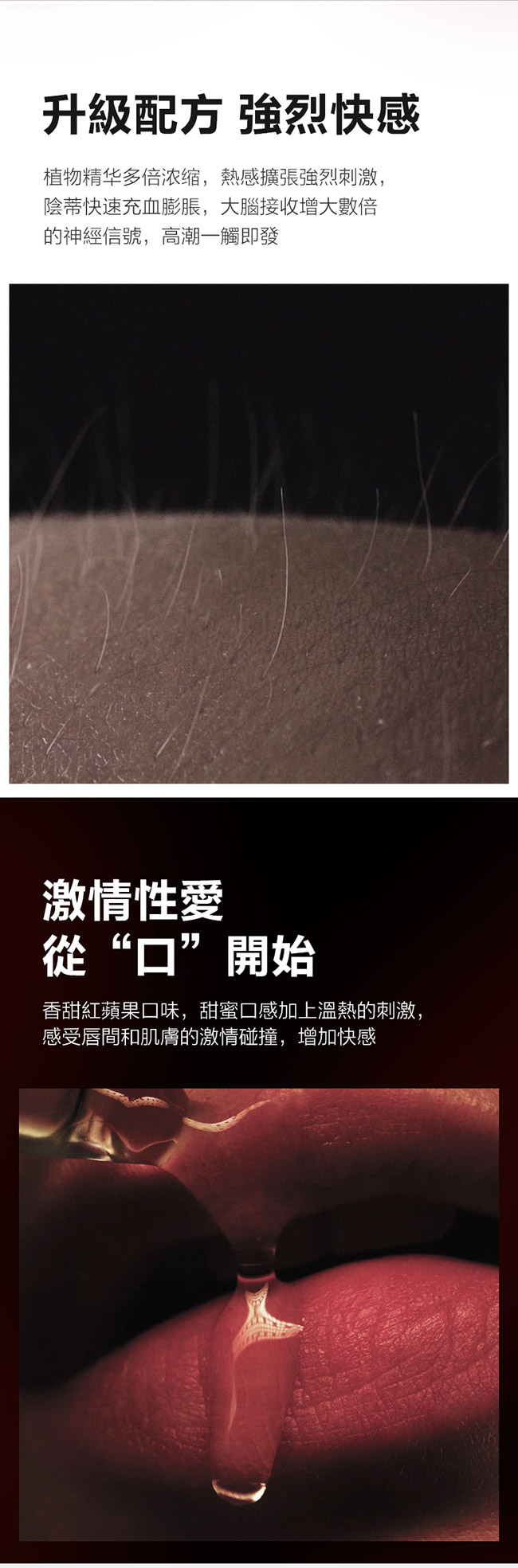 小紅瓶2代,滋養+強烈熱感+可口交,適合喜好強勁高潮感、陰蒂極 不敏感,年齡較大的玩家;起效快,快感無需等待,房事前塗抹在豆 豆,按摩幾秒即可;好清洗,無殘留更安心,遇水即溶愛後用,清水 沖洗即可;溫和養護,呵護嬌嫩私處,維生素E抑制體內性激素水準 的波動,增強新陳代謝到滋養修護的功效;激情性愛,從“口”開始 ,香甜紅蘋果口味,甜蜜口感加上溫熱的刺激,感受唇間和肌膚的激 情碰撞,,增加快感!