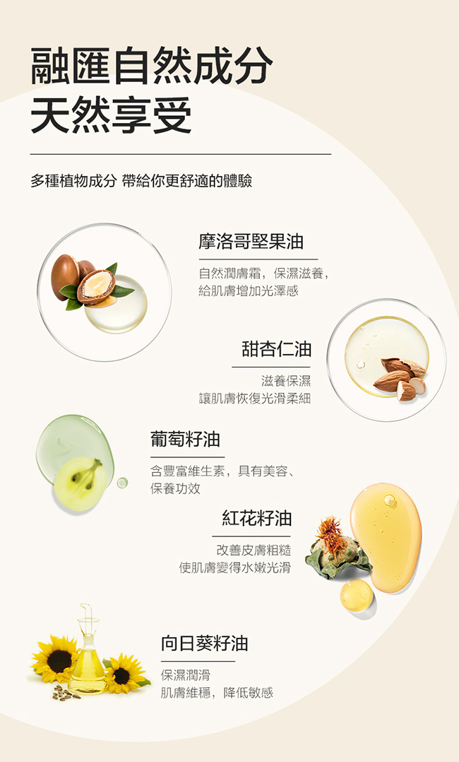· 成分:甜杏仁油,香氣,紅花籽油,葡萄籽油等