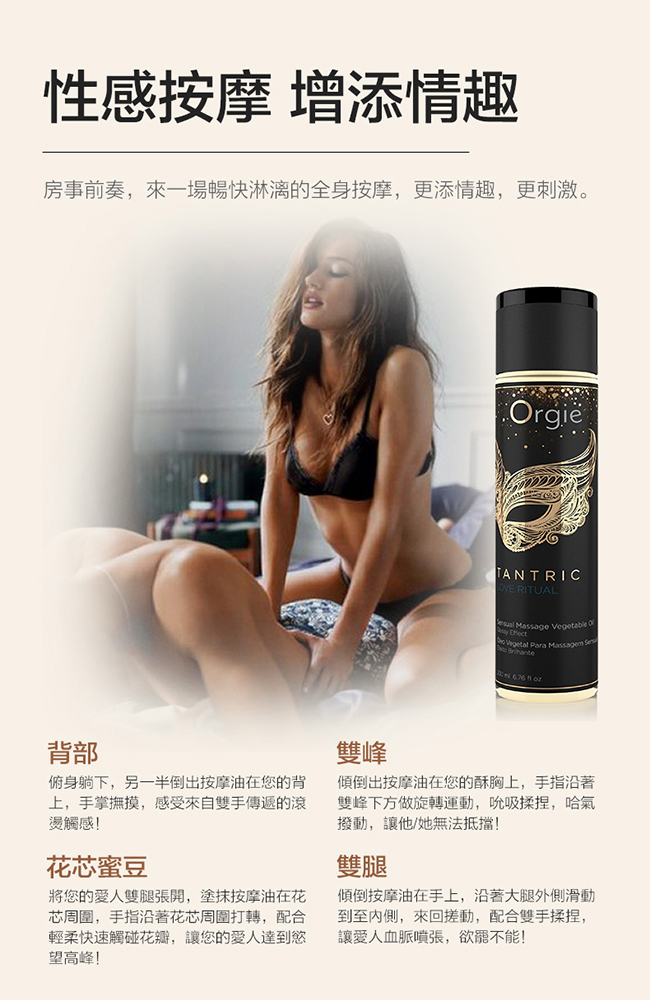 Tantric按摩油是Orgie按摩油系列中最暢銷款。產品100%採用天然植物油為基底,安全爽滑不傷肌膚。富含甜杏仁、葡萄籽、摩洛哥堅果油等多種植物油精華,潤澤肌膚,賦予肌膚一層光澤感,塗抹在身上,散發性感油光;多種繽紛香味,增添嗅覺刺激,在嗅覺和視覺的雙重衝擊下,帶來激爽情趣體驗。