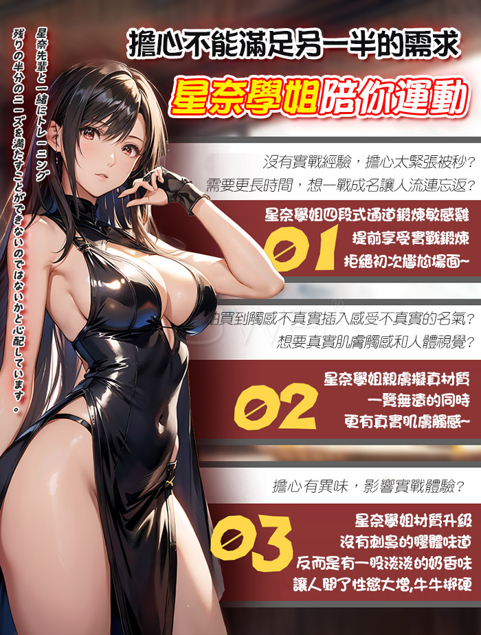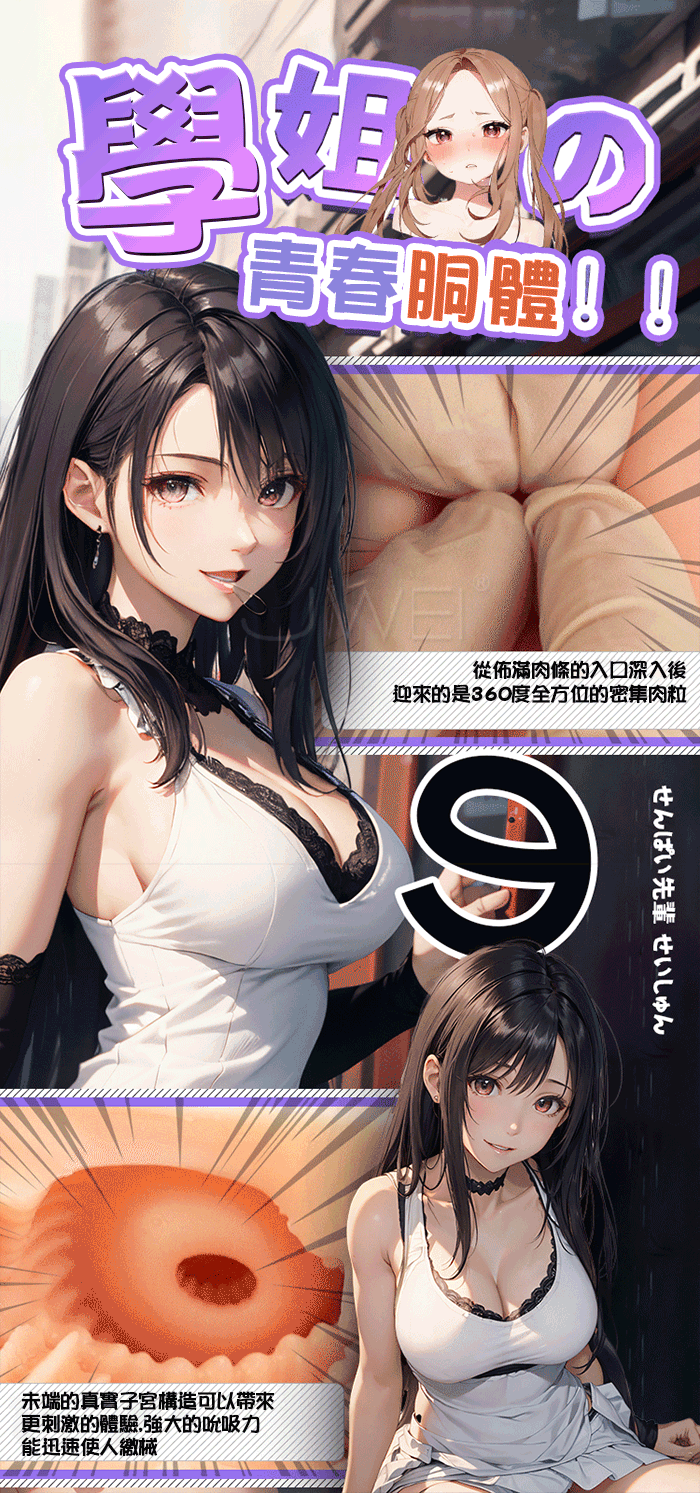實戰の訓練,模擬與知性學姐的刺激衝撞感, 擔心不能滿足另一半的需 求, 星奈學姐陪你運動,四段式の榨汁,子宮突破刺激升級、突進G點肉 粒、密集肉粒摩擦、肉條の舒緩接摩;從佈滿肉條的入口深入後,迎來的 是360度全方位的密集肉粒;未端的真實子宮構造可以帶來,更刺激的體 驗,強大的吮吸力,能迅速使人繳械!