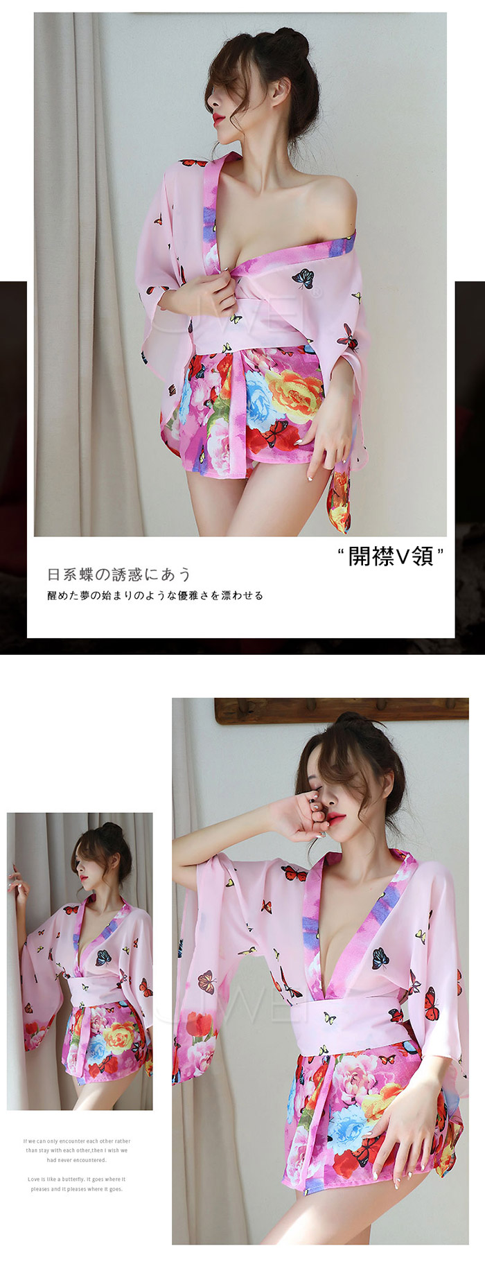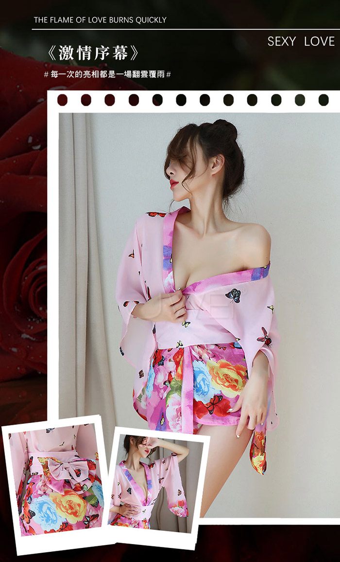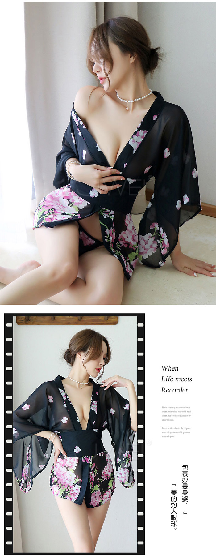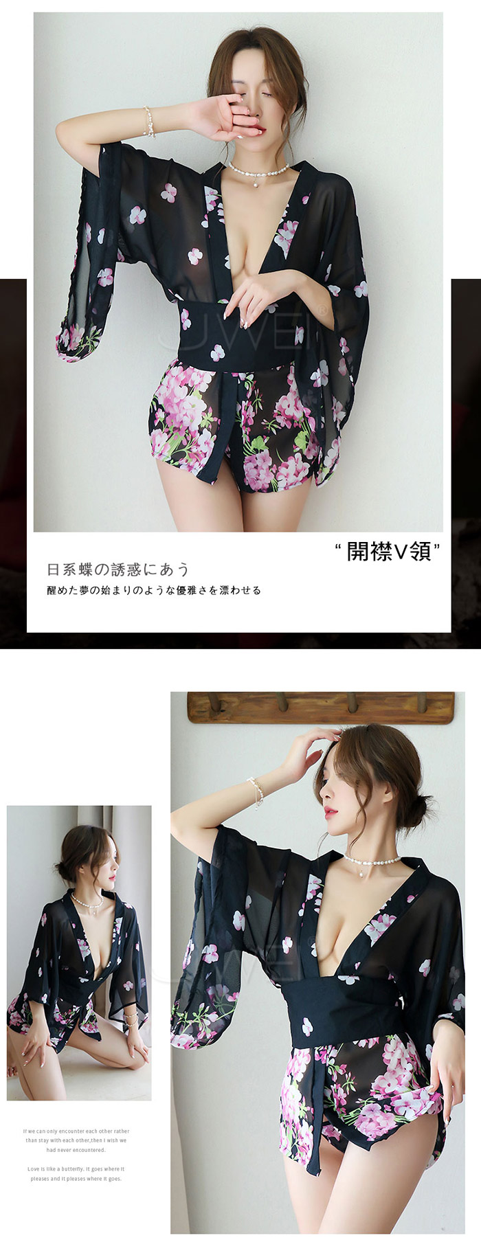 ►您現在的位置:首頁>幻蝶誘夢.性感誘惑開襟V領印花日式和服套裝3件組(黑)