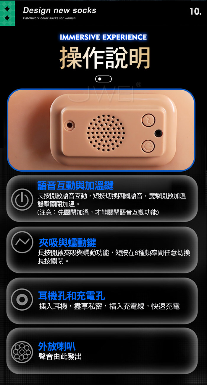 新時代智能夾吸美臀,翹臀震顫,女上位式抖臀,擁抱觸電般的眩暈感 仿真通道,女性私處複製仿真構造,陰肛雙穴,前後不同體驗,姿勢多 變把玩各種體位;四國發聲聽著她的喘息聲,體驗小姐姐的身臨其境; 智慧晶片加溫,體驗小姐姐的通道溫度,給性福來一擊全壘打!