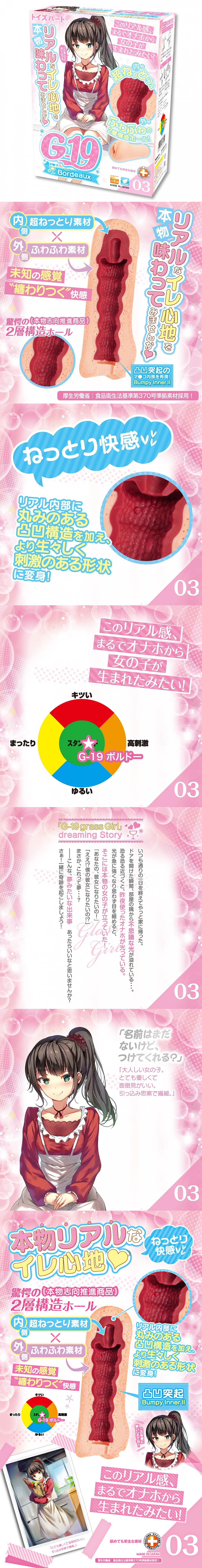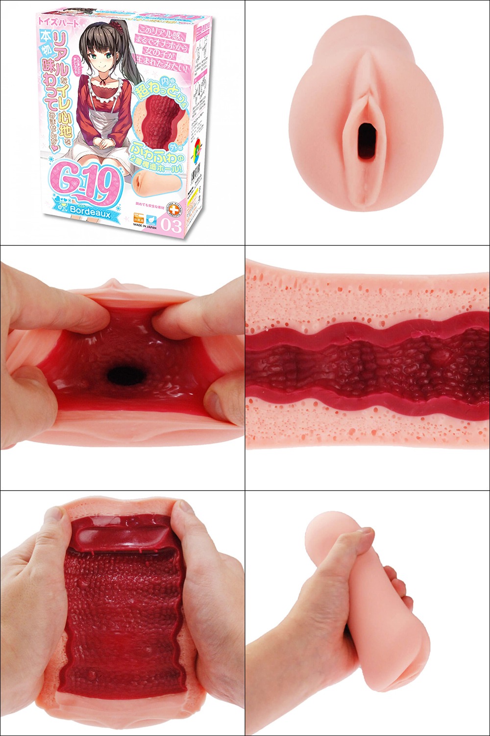 G-19 波爾多採用了嶄新的雙重物質技術來製造。外層的物質加入了無數小氣泡,手持質感特別鬆軟,有彈性。內層物質軟硬適中,無數的肉粒加強了管道內的刺激度。頂部設有子宮口,能增加刺激感,更可令龜頭感覺額外吸吮感。
