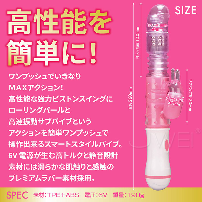 強力ピストンスイング+ローリングパール・高速振動サブバイブという高性能アクションをワンプッシュで操作出来るスマートスタイルバイブでです。