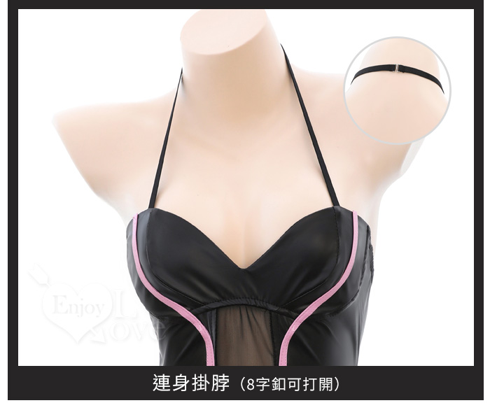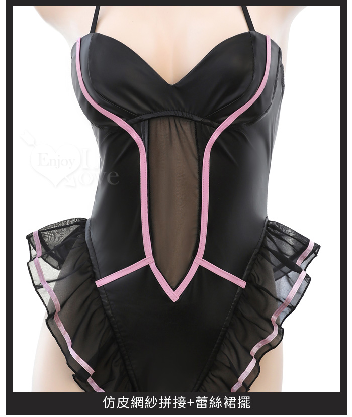 ►您現在的位置:首頁>狂野連身衣!掛脖露背漆皮網紗拚接花邊裙襬暗釦開襠三件組