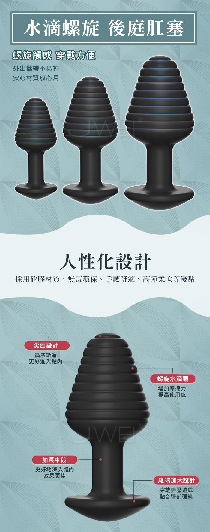 水滴螺旋。後庭肛門塞 新穎螺旋紋,螺旋紋增加摩擦力,體液流動順滑