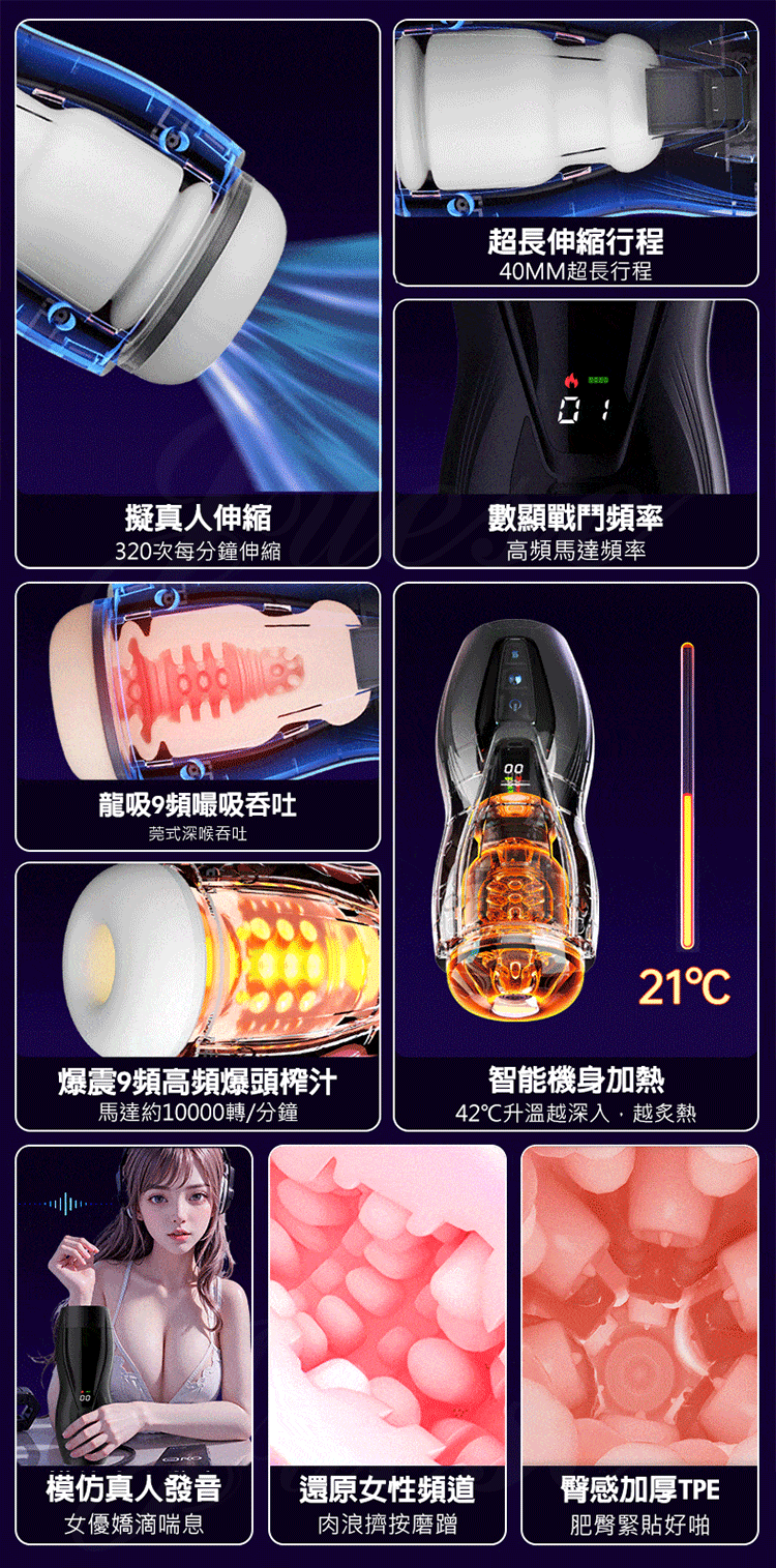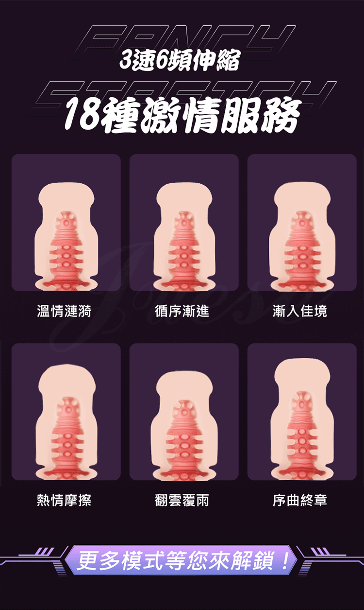 從頭榨到根爽感加倍,內嵌式震動波,3速6頻伸縮,18種激情服務。