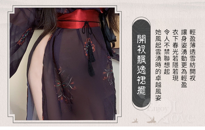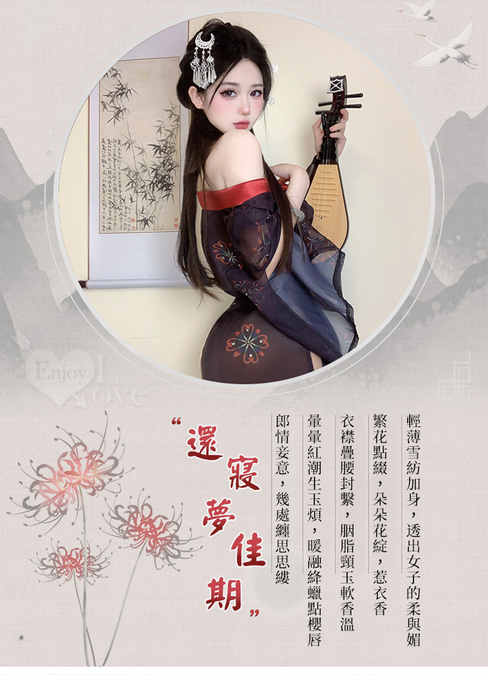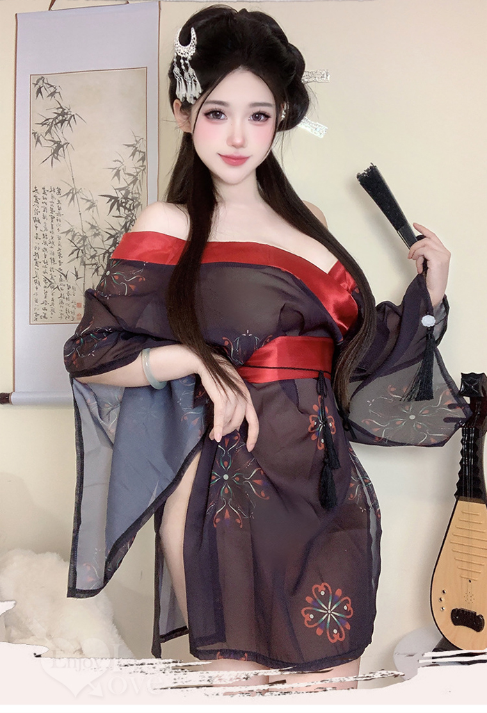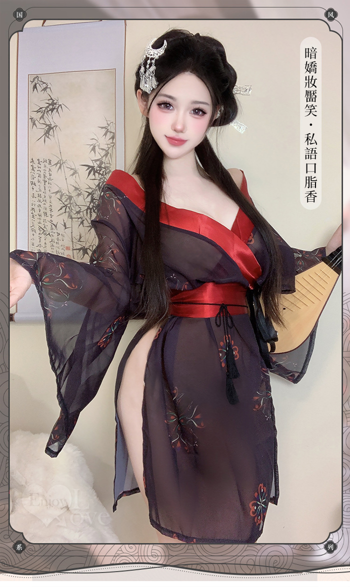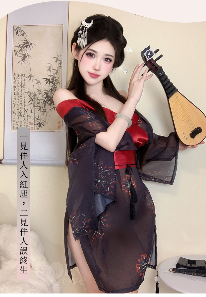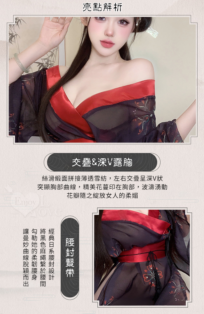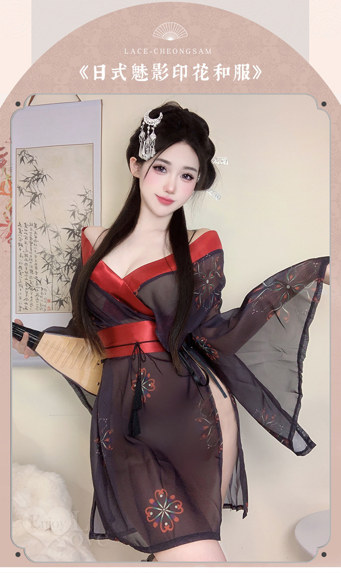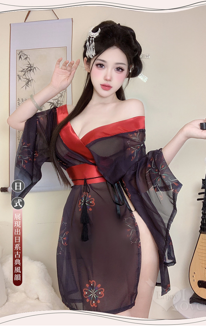 ►您現在的位置:首頁>情趣和服!低領美肩日系緞面拼接薄透雪紡印花側高衩三件組